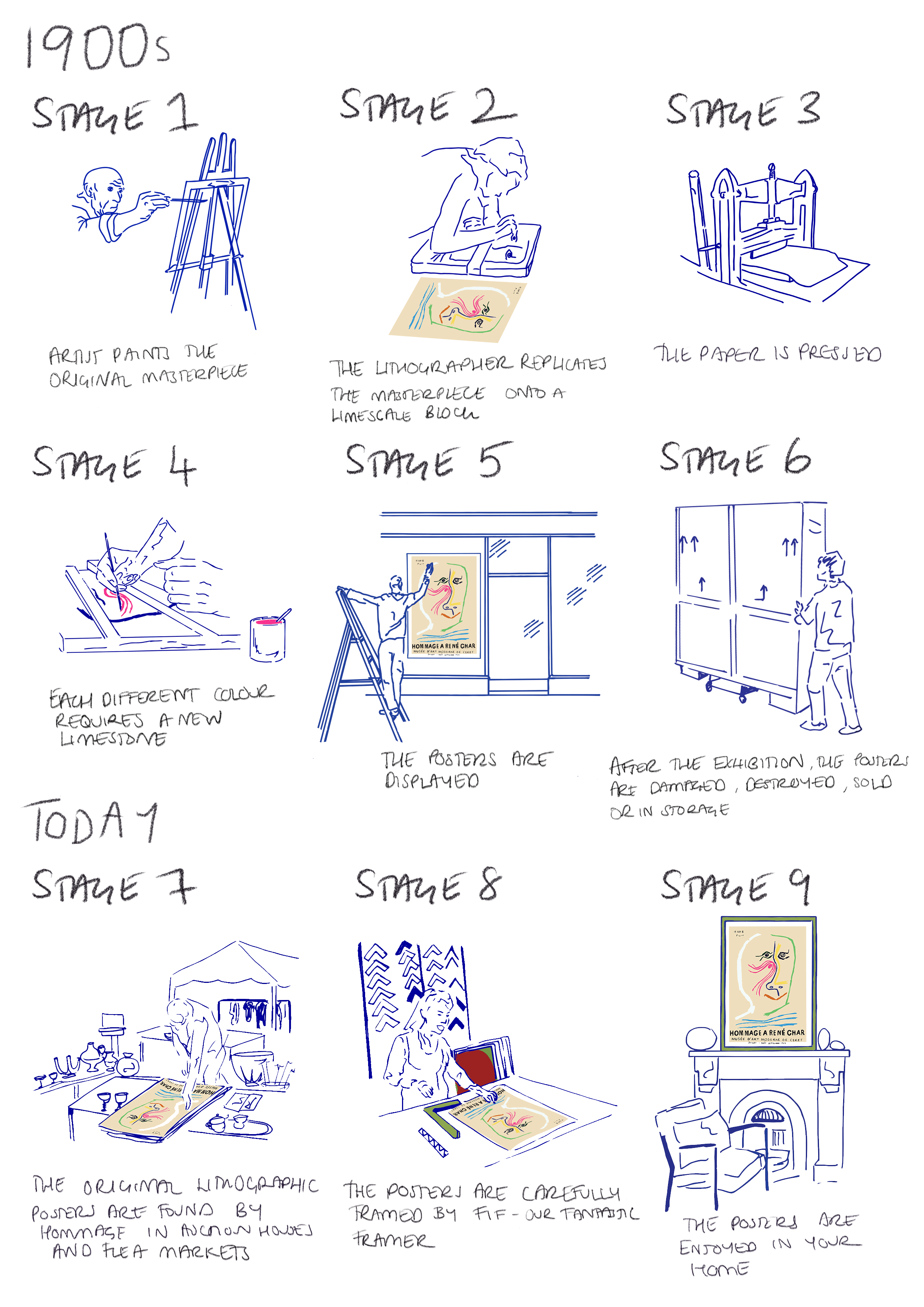 Picasso, Matisse, Miró, Chagall, Léger and many other leading Modern artists carefully produced their own exhibition posters during the mid-1900s and collaborated, chiefly, with the pioneers of lithographic printing such as Mourlot Studios in Paris.