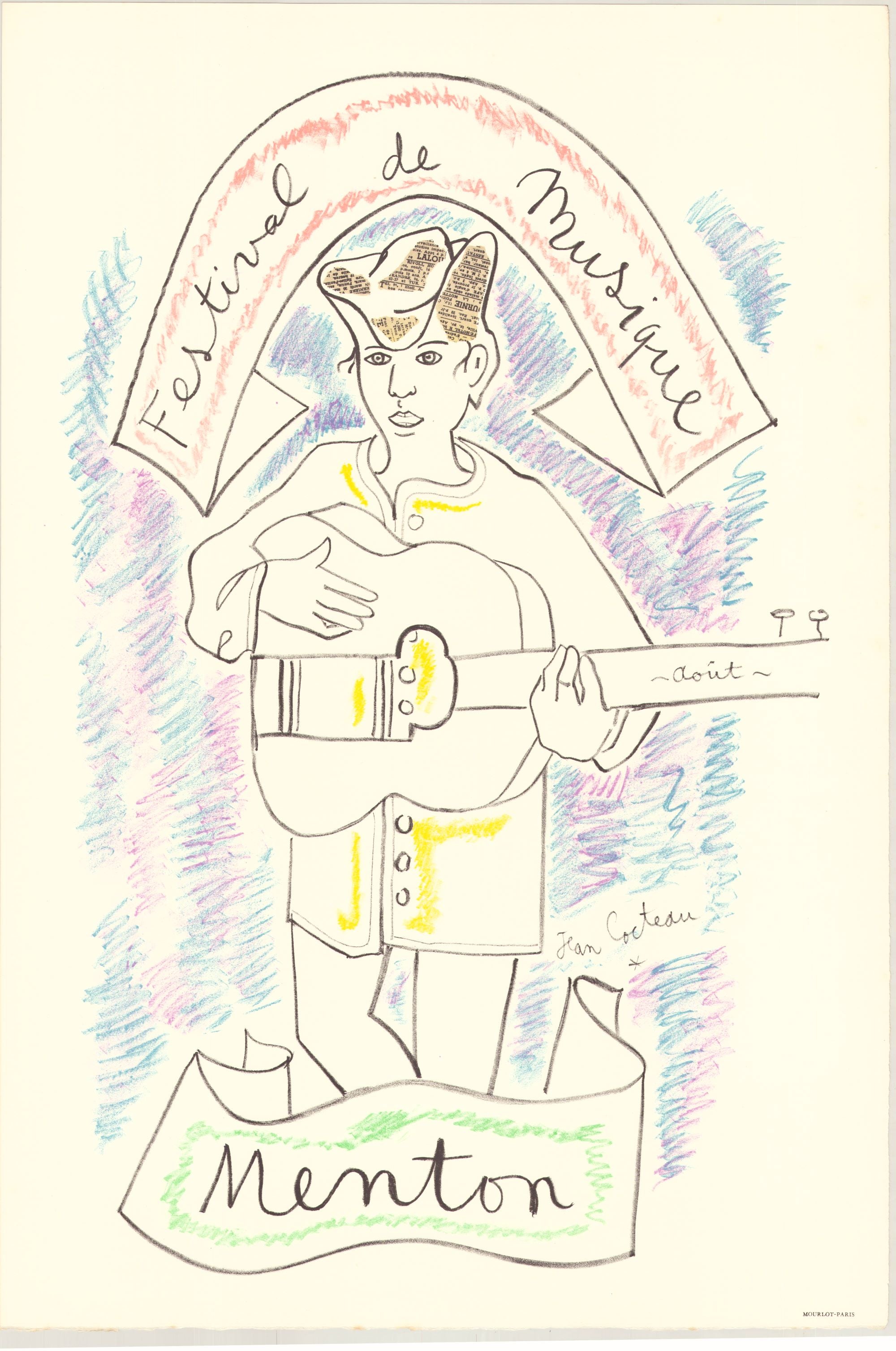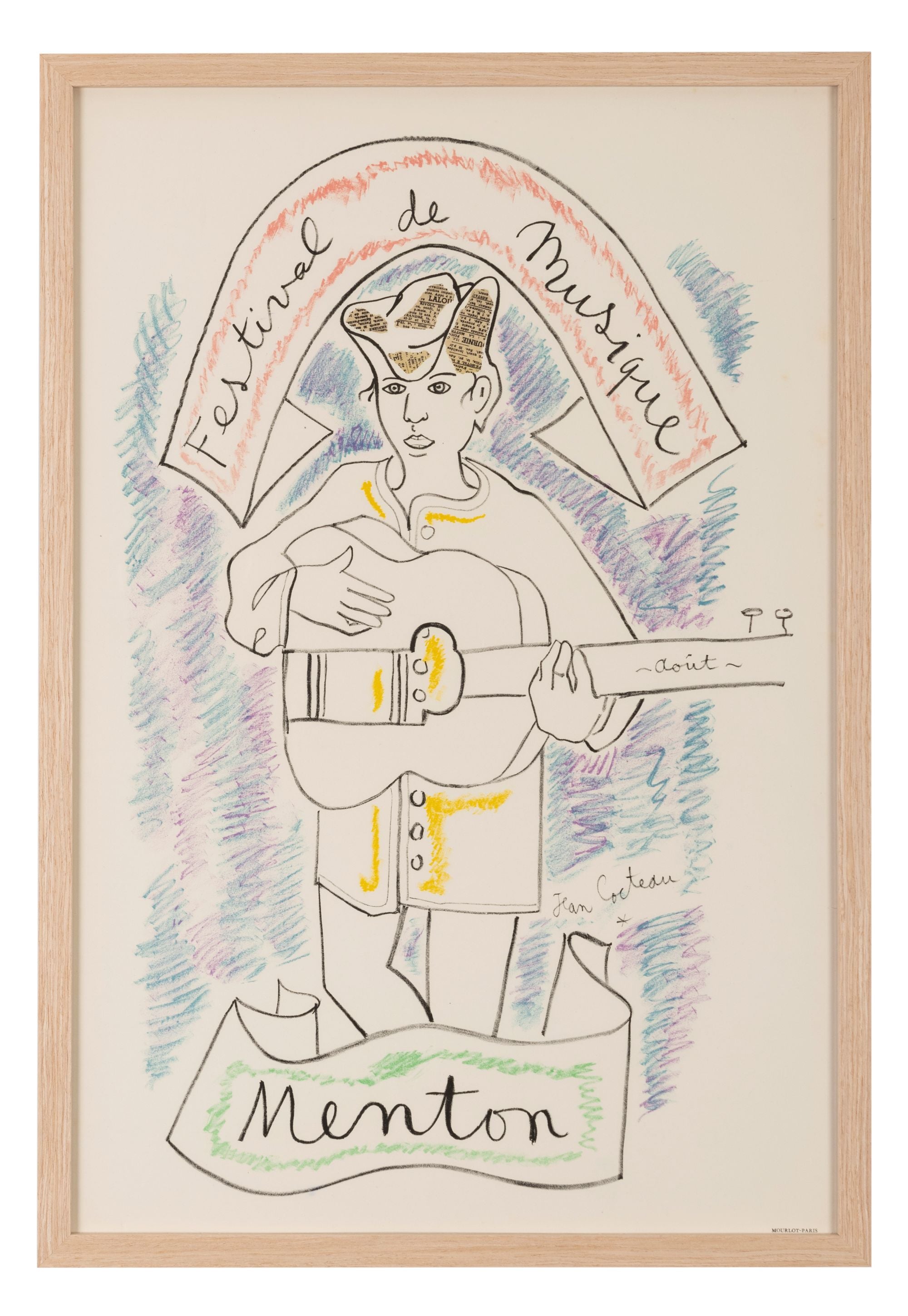 Description: Original lithograph poster created by Cocteau for the Festival de Musique de Menton, a prestigious classical musical event held in Menton.