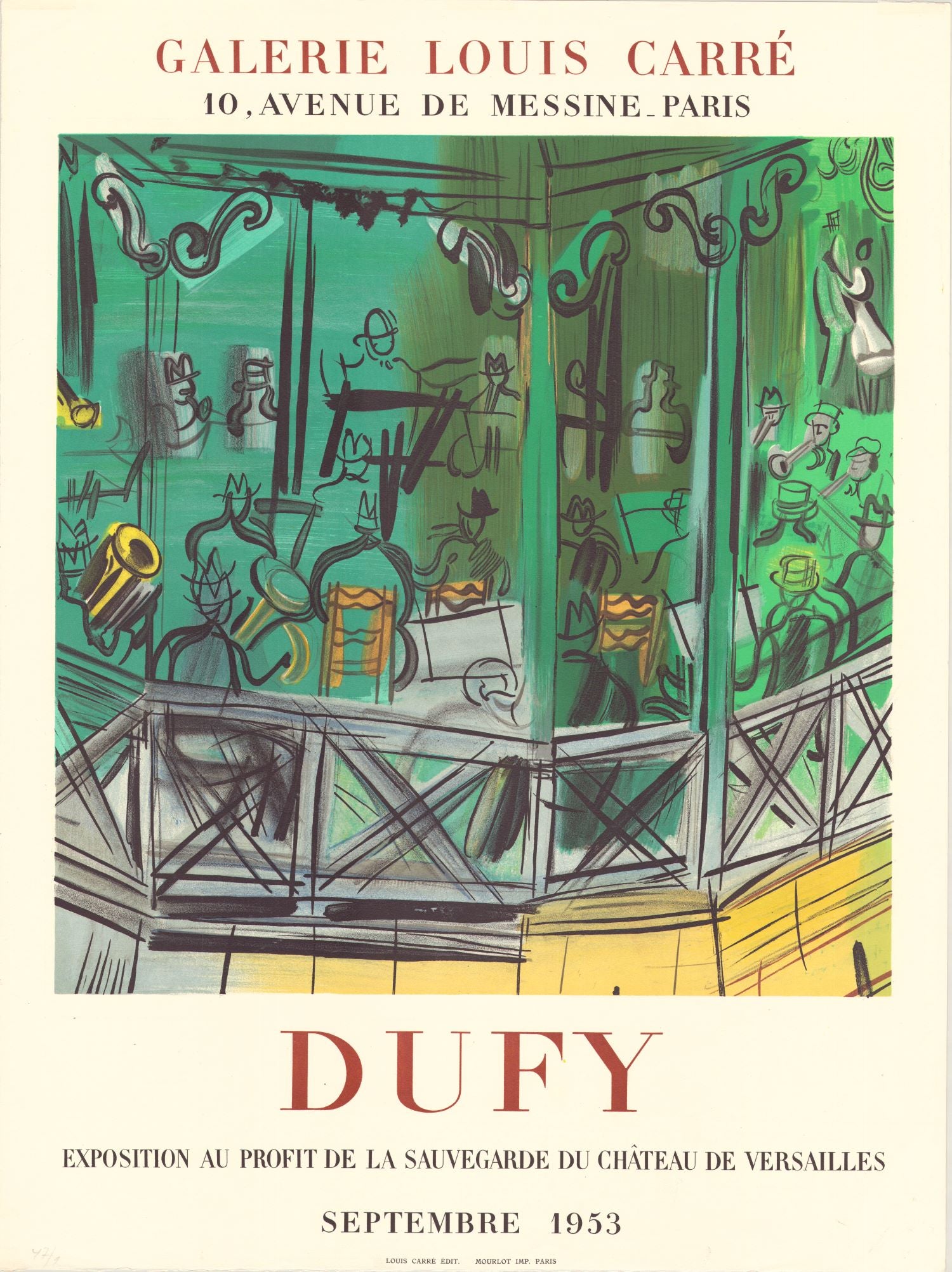 Description: This original lithograph, illustrated with an image of a French bandstand, was printed for Dufy’s exhibition at Galerie Louis Carré, six months after his death. The exhibition was extended to October but this is the original edition for September 1953.