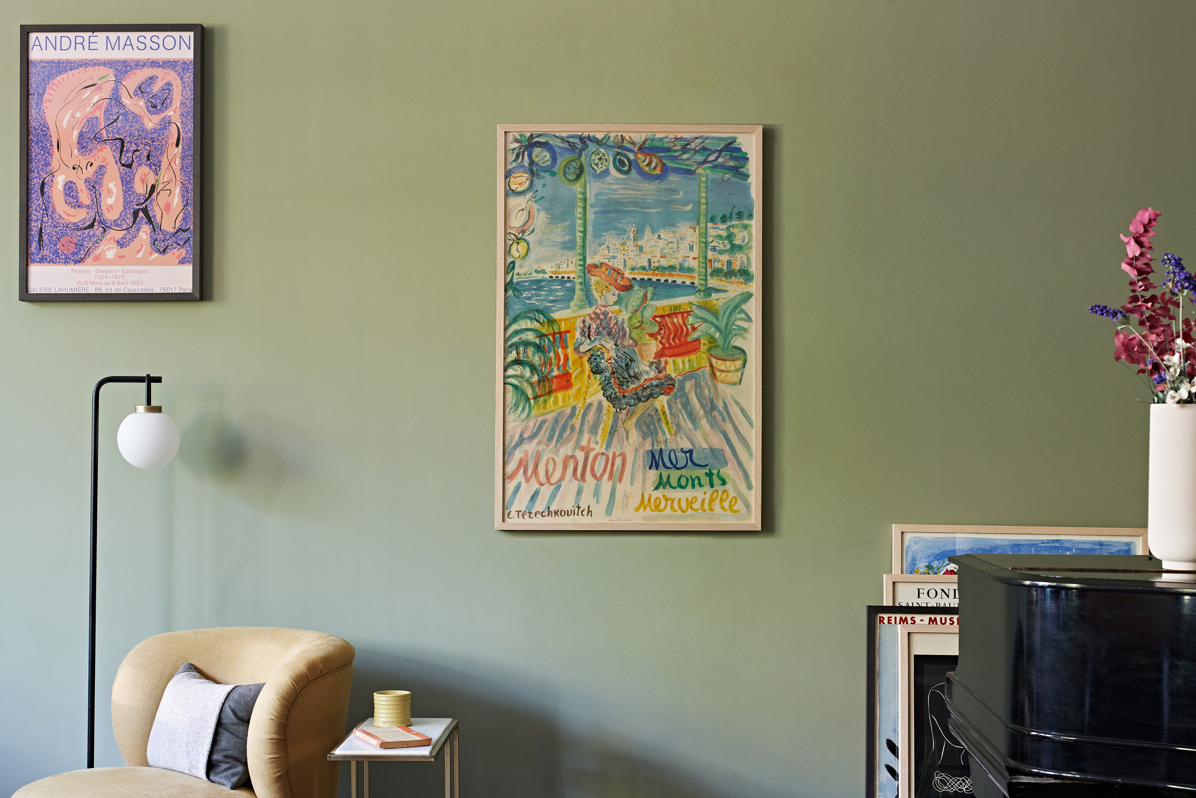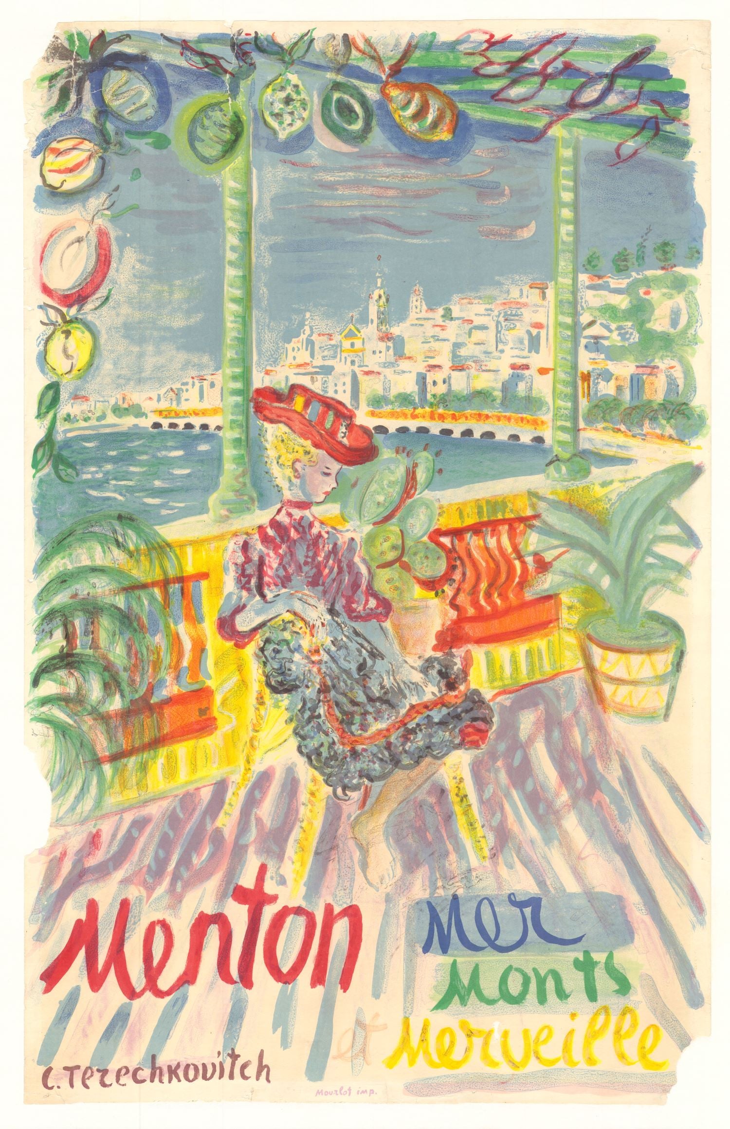 Description: This is an original French tourist poster by Térechkovitch, printed by Mourlot, to promote Menton on the French Riviera and the marvellous sea and mountains.