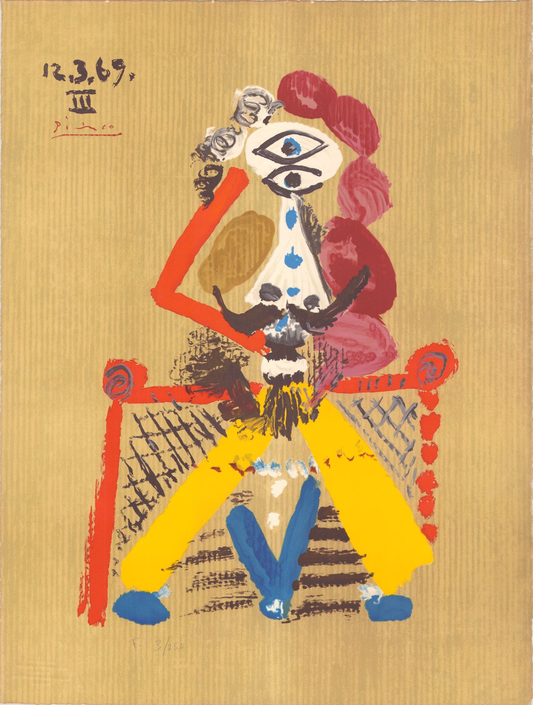 Description: This lithograph is one of Picasso’s 29 exceptional and rare Portraits Imaginaires. The artist began the series during a feverish painting spell at the beginning of 1969, aged 87. After poor press from exhibitions, he was exhausted and depressed and, inspired by the colours of the south of France, and Rembrandt’s prolific output right up until his death, he began to do something he had never done before. He saved corrugated paper and other packaging materials from the deliveries of art supplies, and on 30th January, he started painting these mainly masculine portraits inspired by images of his father, Rembrandt, Shakespeare, Balzac and others. He finished his 29th painting on the 7th May, 1969. So excited with the results, Picasso spent many months with Marcel Salinas to reproduce his first ever series of original works as fine art lithographs. Two print runs of 250 copies were made: one for the French market and one for America.