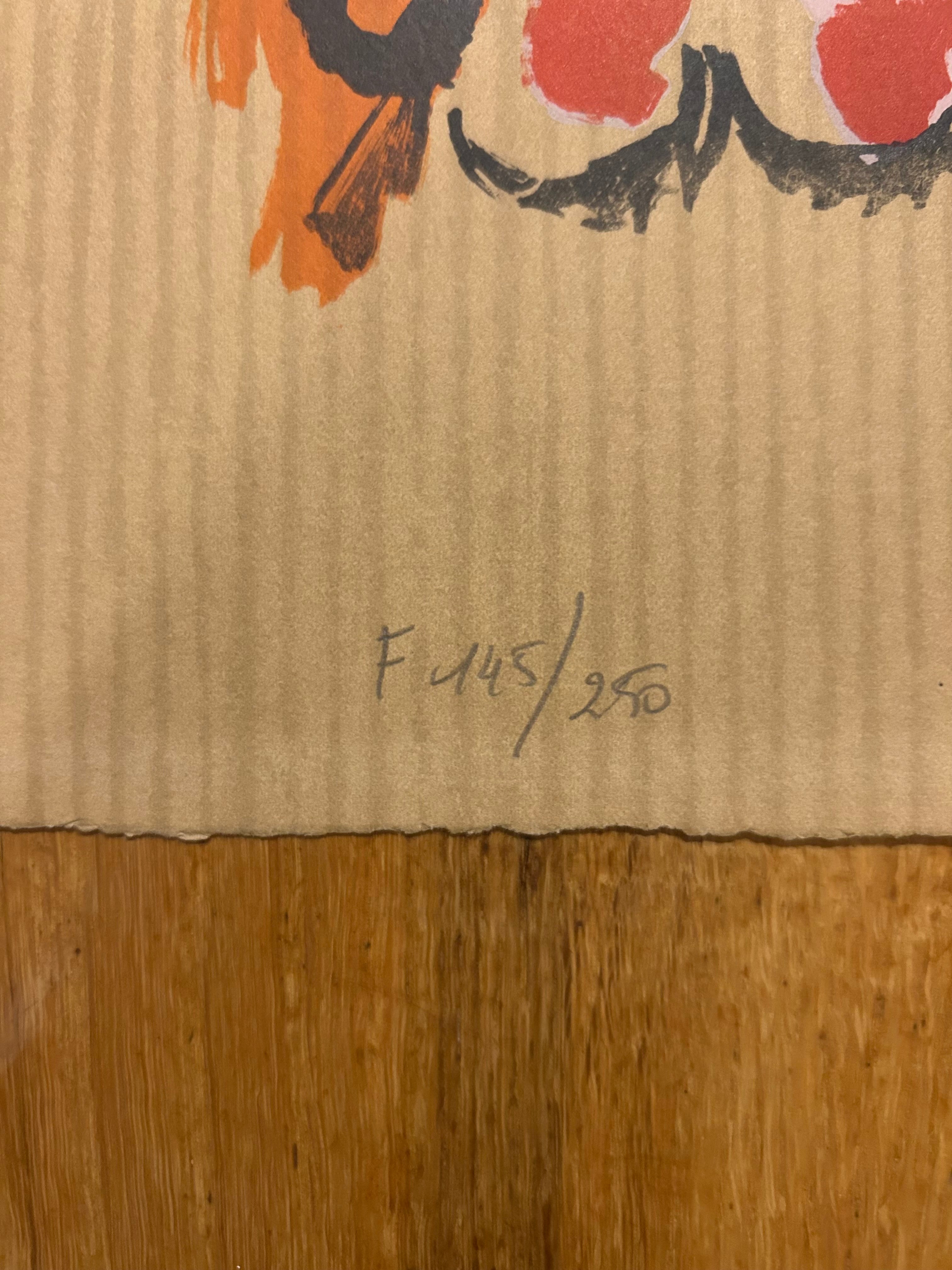 Description: This lithograph is one of Picasso’s 29 exceptional and rare Portraits Imaginaires. The artist began the series during a feverish painting spell at the beginning of 1969, aged 87. After poor press from exhibitions, he was exhausted and depressed and, inspired by the colours of the south of France, and Rembrandt’s prolific output right up until his death, he began to do something he had never done before. He saved corrugated paper and other packaging materials from the deliveries of art supplies, and on 30th January, he started painting these mainly masculine portraits inspired by images of his father, Rembrandt, Shakespeare, Balzac and others. He finished his 29th painting on the 7th May, 1969. So excited with the results, Picasso spent many months with Marcel Salinas to reproduce his first ever series of original works as fine art lithographs. Two print runs of 250 copies were made: one for the French market and one for America.