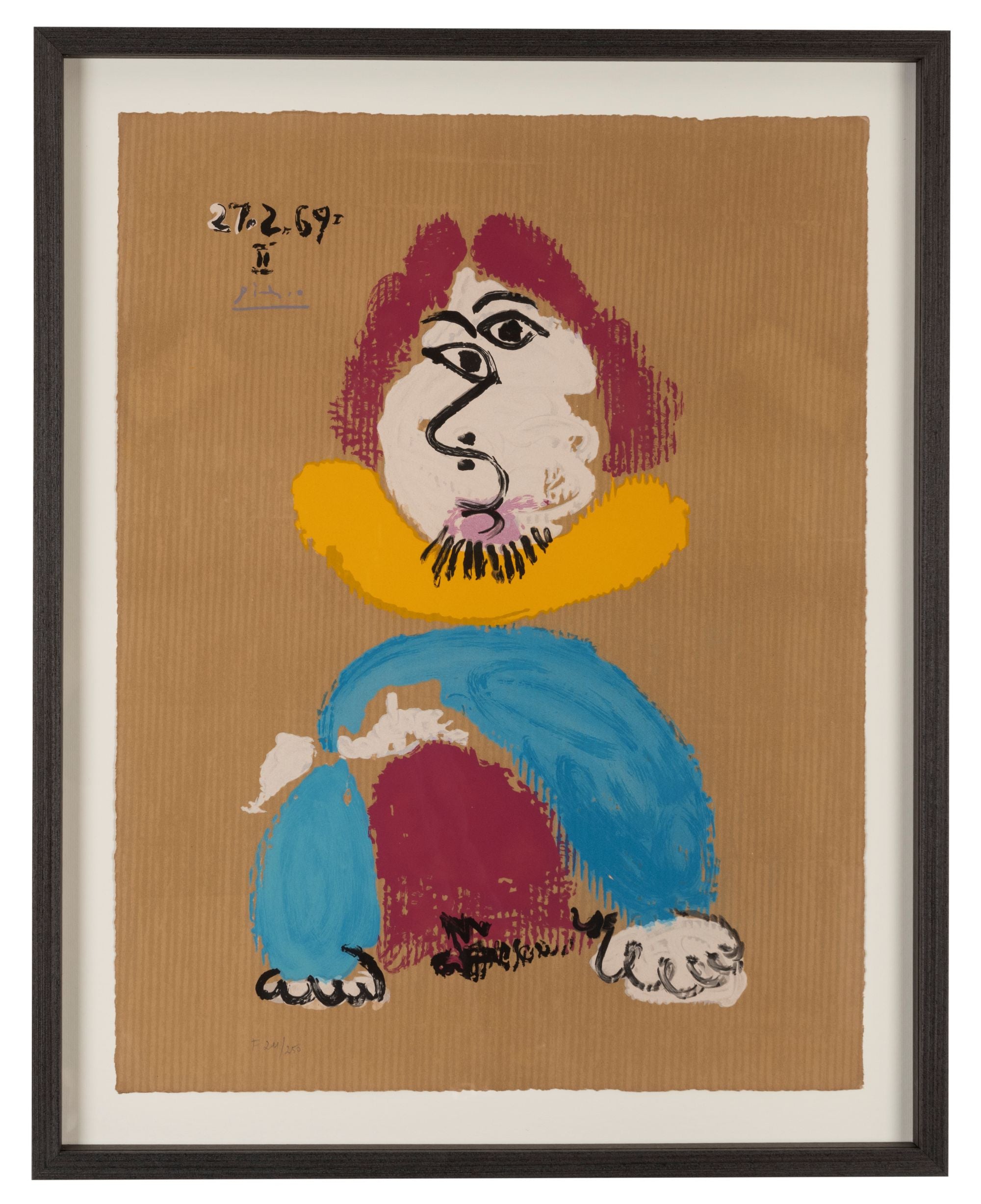 Description: This lithograph is one of Picasso’s 29 exceptional and rare Portraits Imaginaires. The artist began the series during a feverish painting spell at the beginning of 1969, aged 87. After poor press from exhibitions, he was exhausted and depressed and, inspired by the colours of the south of France, and Rembrandt’s prolific output right up until his death, he began to do something he had never done before. He saved corrugated paper and other packaging materials from the deliveries of art supplies, and on 30th January, he started painting these mainly masculine portraits inspired by images of his father, Rembrandt, Shakespeare, Balzac and others. He finished his 29th painting on the 7th May, 1969. So excited with the results, Picasso spent many months with Marcel Salinas to reproduce his first ever series of original works as fine art lithographs. Two print runs of 250 copies were made: one for the French market and one for America.