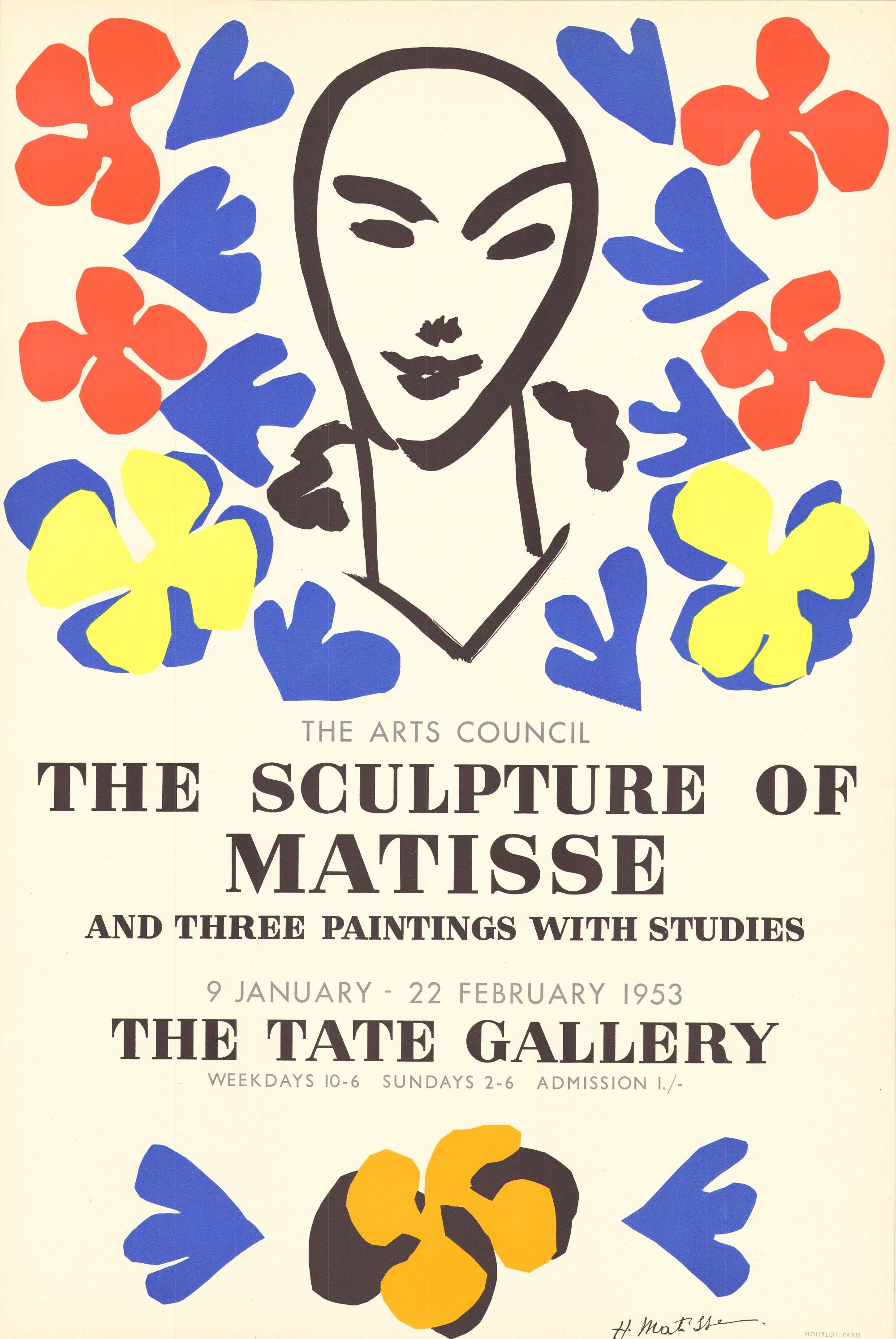 Description: Matisse was virtually unknown as a sculptor before this show which this poster really collectible. This favourite poster here at Hommage promoted his exhibition which brought together almost the entire oeuvre of Matisse’s sculpture totalling 48 pieces along with studies for six paintings and drawings.